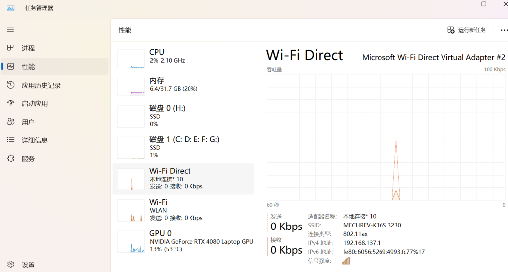 之后选择打开电脑的热点模式,此时请打开任务管理器,记住WiFi Direct(或本地连接)的IPv4地址[您也可使用ipconfig命令查询]