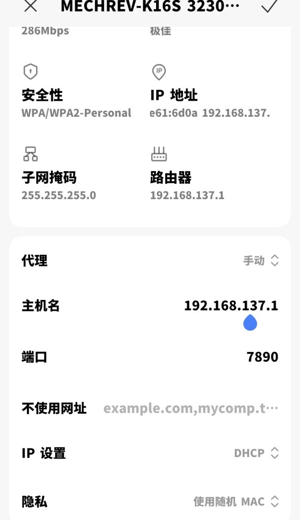 此时可在手机内连接电脑的无线热点,并手动更改主机名(即填入之前的IPv4地址)与端口(默认为7890)